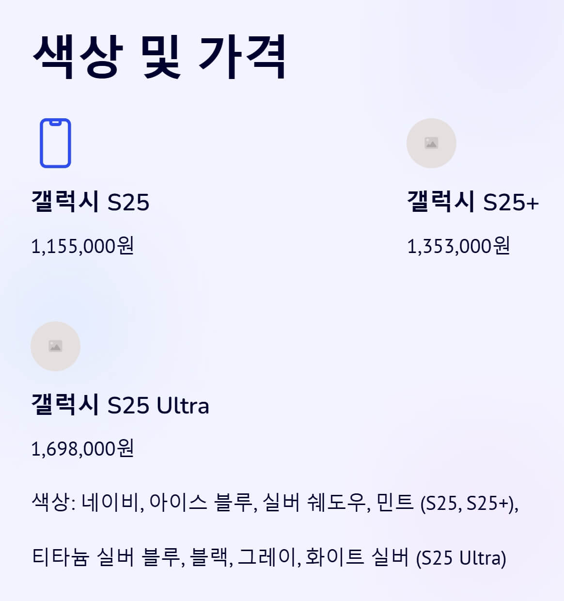 - 갤럭시 S25 울트라: 티타늄 실버 블루, 티타늄 블랙, 티타늄 그레이, 티타늄 화이트 실버