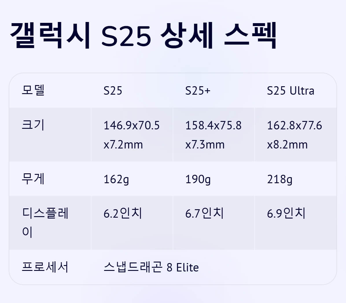 특히 프로세서의 변화가 눈에 띄는데요, 아래 표를 통해 전작인 S24와 비교해 보겠습니다.