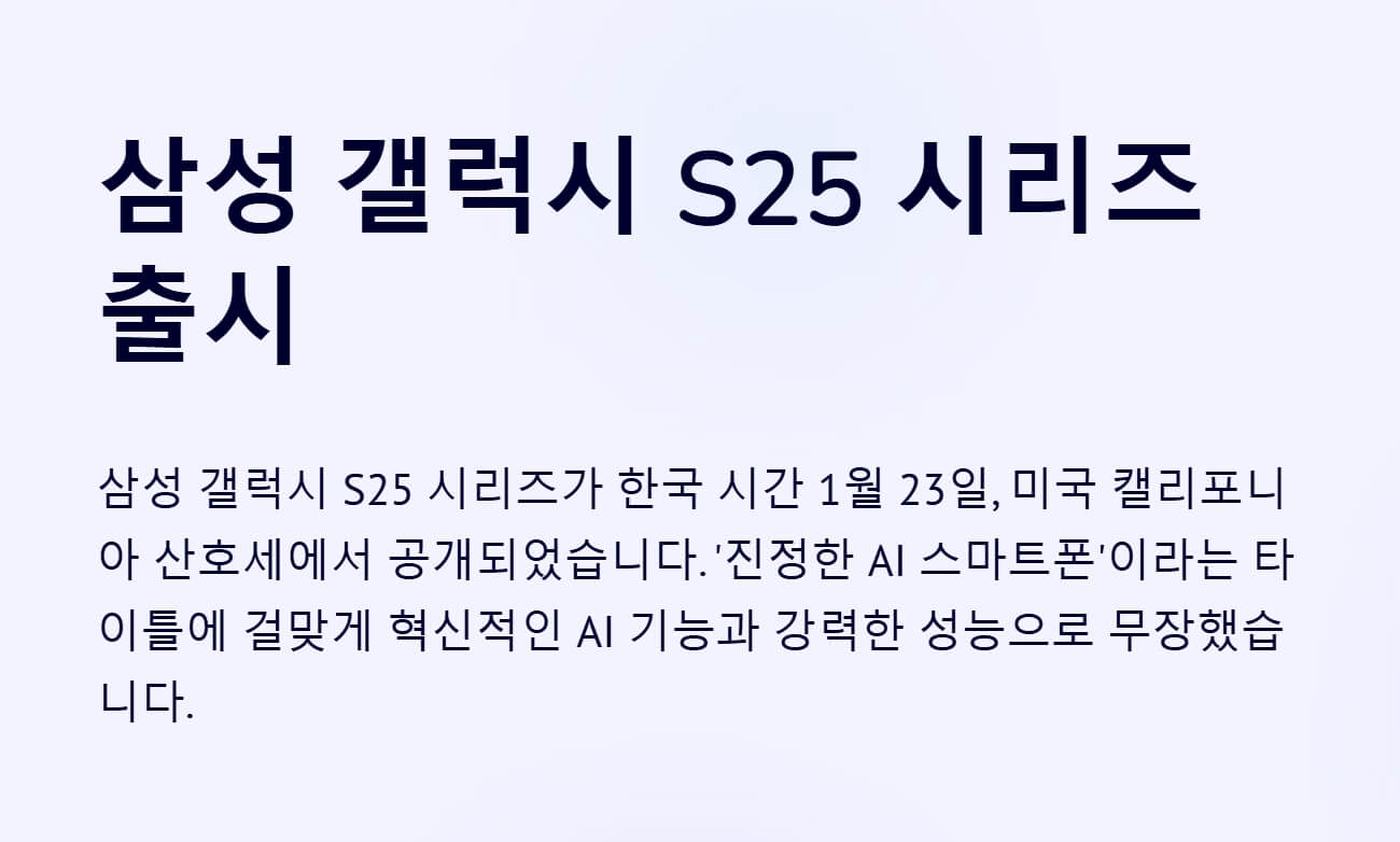 혁신적인 AI 기능과 강력한 성능으로 돌아온 갤럭시 S25 시리즈는 모바일 경험의 새로운 지평을 열 것으로 기대됩니다.