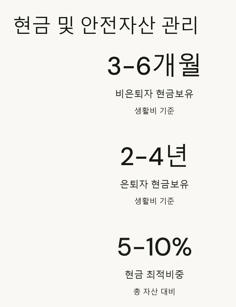 최적 비중: 총 자산의 5-10%를 현금으로 보유하는 것이 좋습니다.