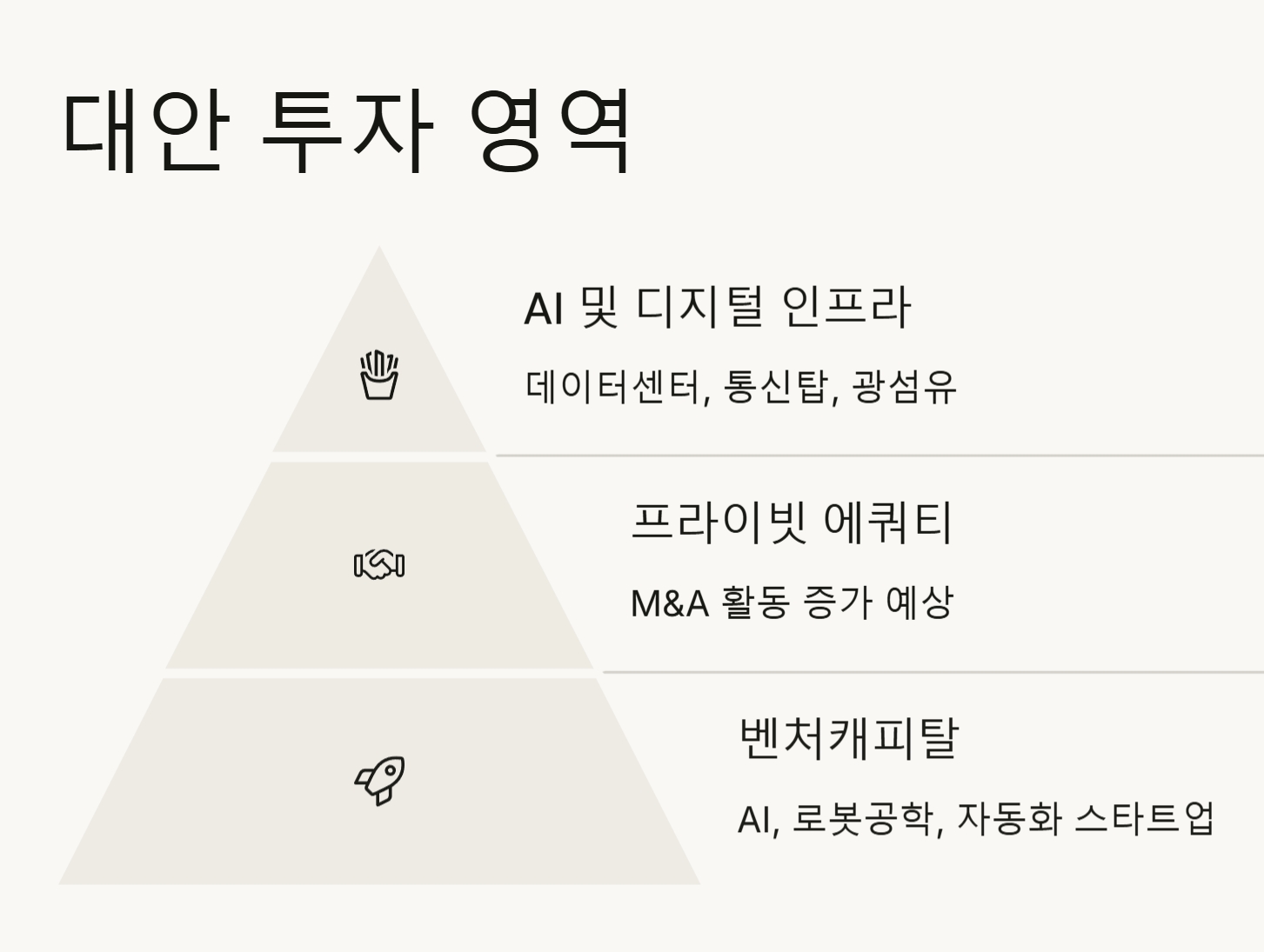 이러한 인프라는 안정적인 수익을 제공하며, 장기적인 성장 가능성이 높습니다. - 프라이빗 에쿼티: