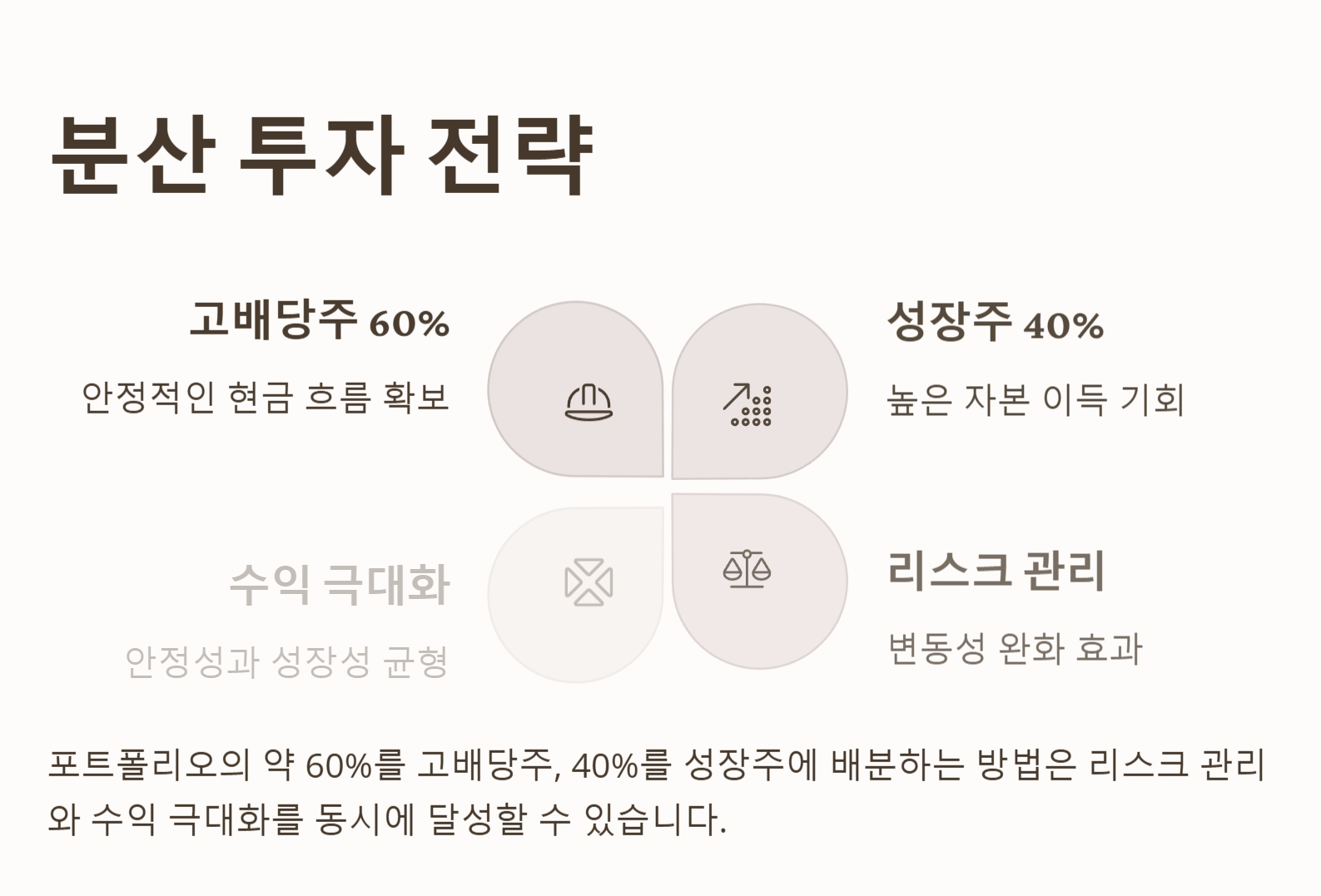 고배당주 vs 성장주, 어디에 투자할까? 이 질문의 가장 현실적인 답은 '둘 다' 투자하는 것입니다. 고배당주와 성장주를 적절히 섞어 '나만의 황금 비율'을 찾는 분산 투자가 중요합니다.