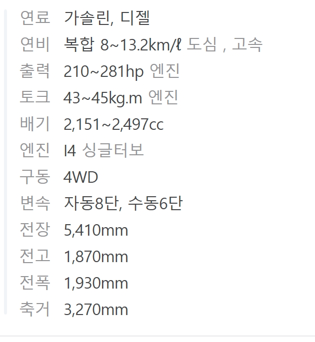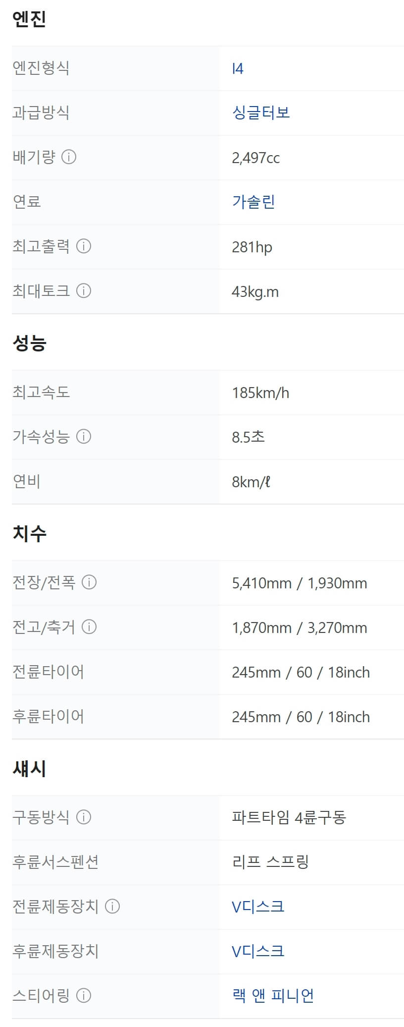 - 2.5L 가솔린 터보 엔진 (281마력/43kg.m)