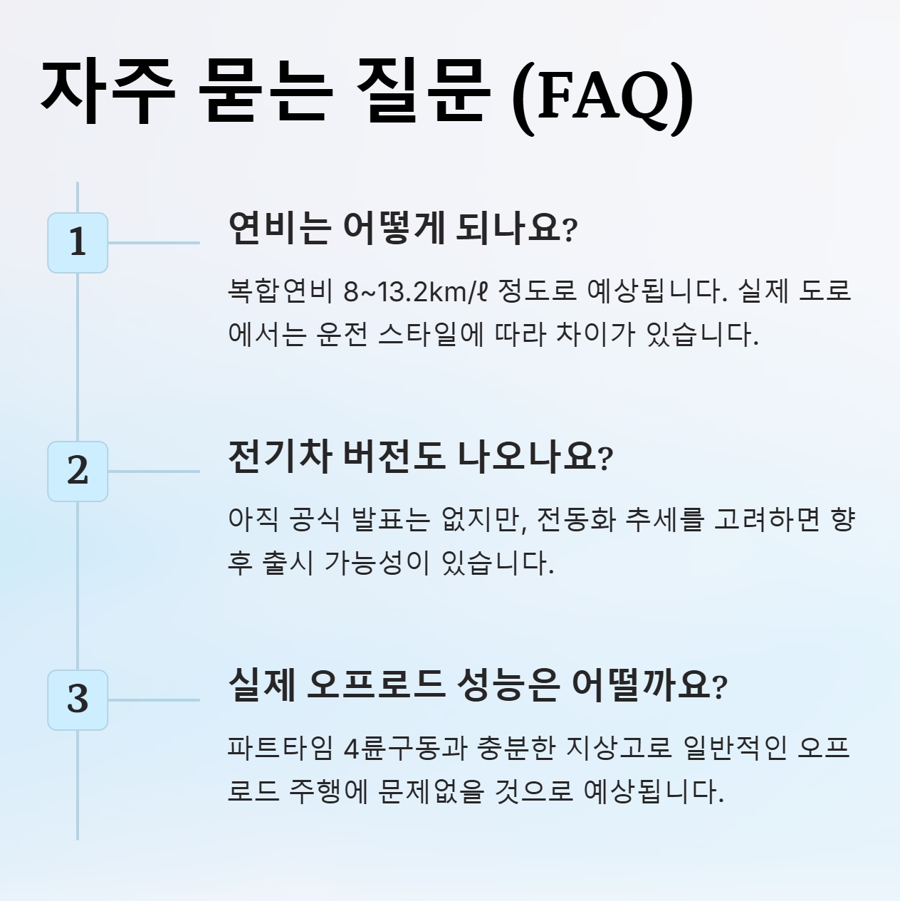 A: 복합연비 8~13.2km/ℓ 정도로 예상됩니다. 실제 도로에서는 운전 스타일에 따라 차이가 있겠죠.