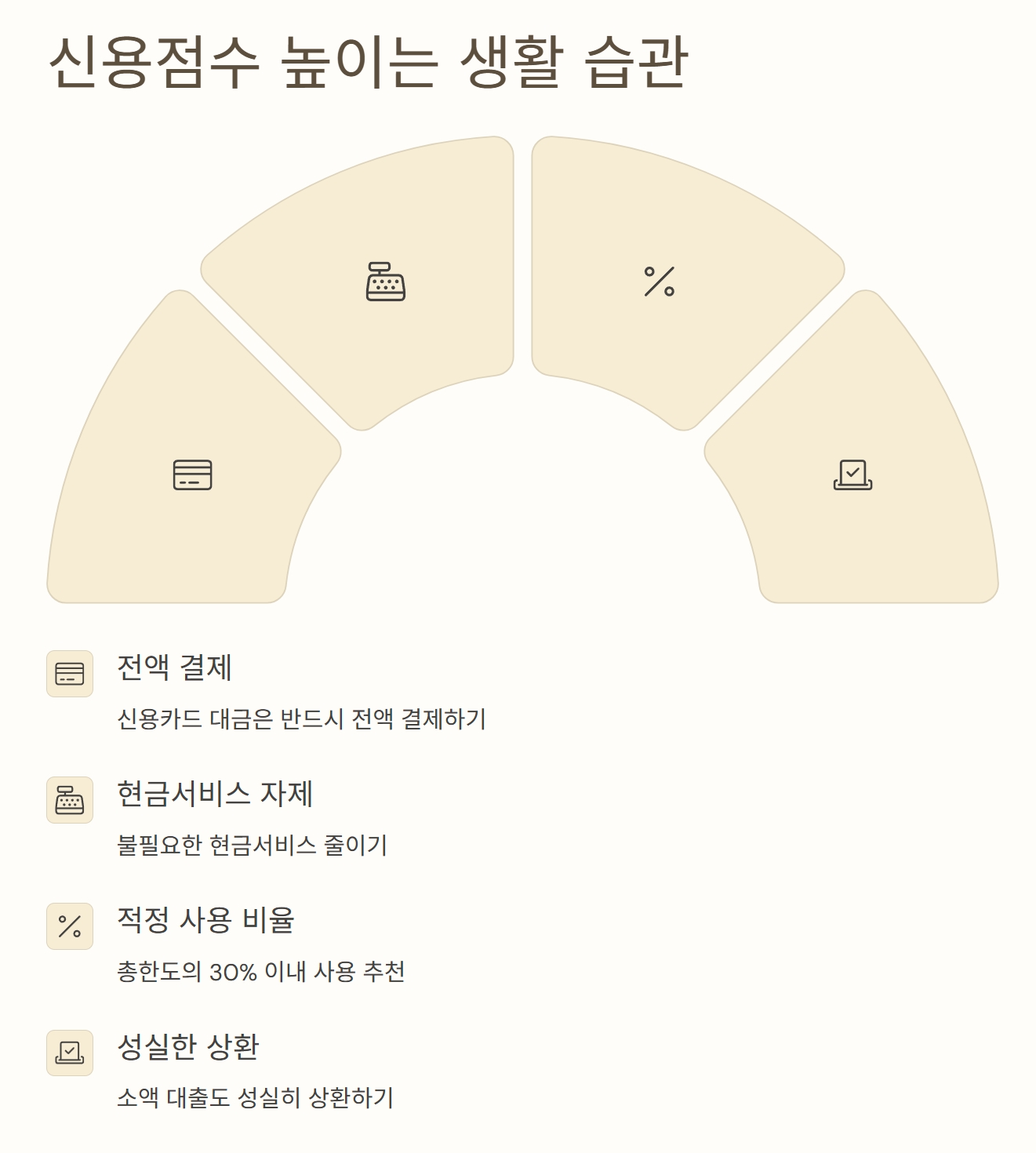 - 적정한 신용카드 사용 비율 유지하기 (총한도의 30% 이내 추천)