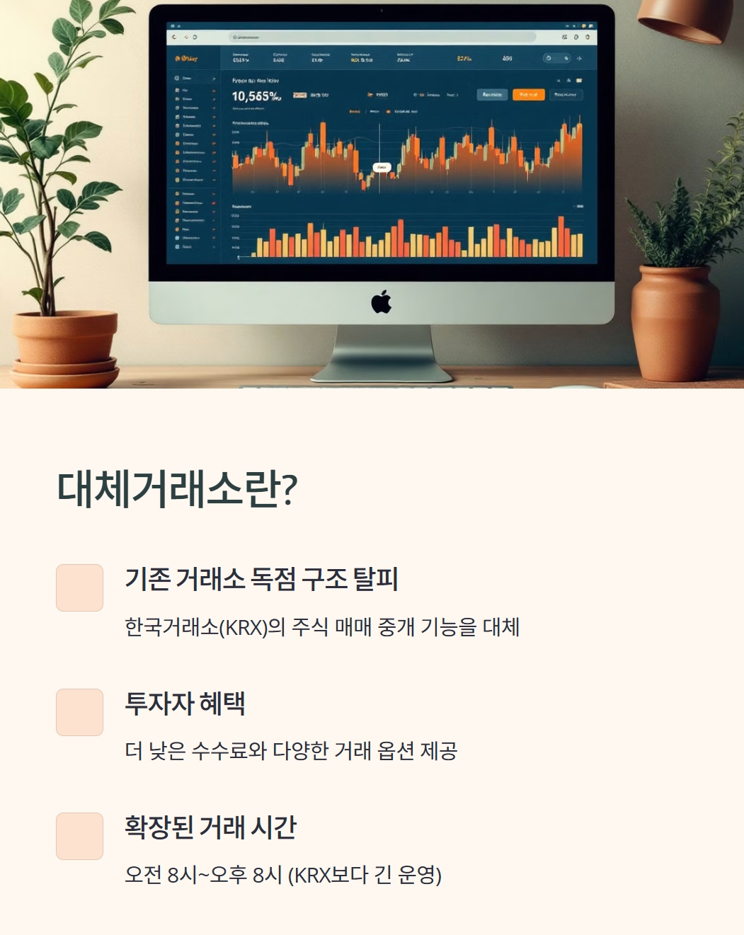 대체거래소(ATS, Alternative Trading System)는 기존 거래소의 독점 구조를 깨고 경쟁 체제를 도입하기 위해 설립된 주식 거래 플랫폼입니다.