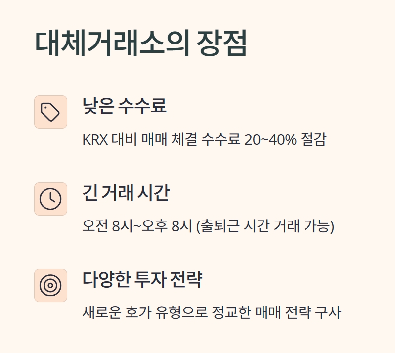 - 운영 시간: 오전 8시~오후 8시 (기존 KRX보다 긴 거래 시간)