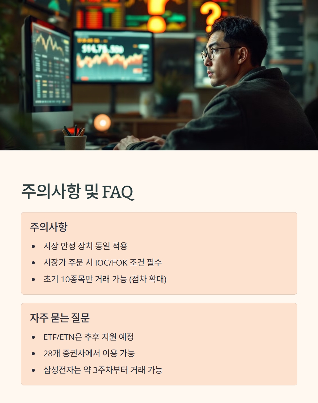 투자자들은 낮은 수수료와 새로운 주문 유형을 활용해 효율적인 매매 전략을 구사할 수 있습니다. 다만, 초기에는 제한된 종목과 시스템 적응 기간이 필요하므로 신중하게 접근하는 것이 중요합니다.