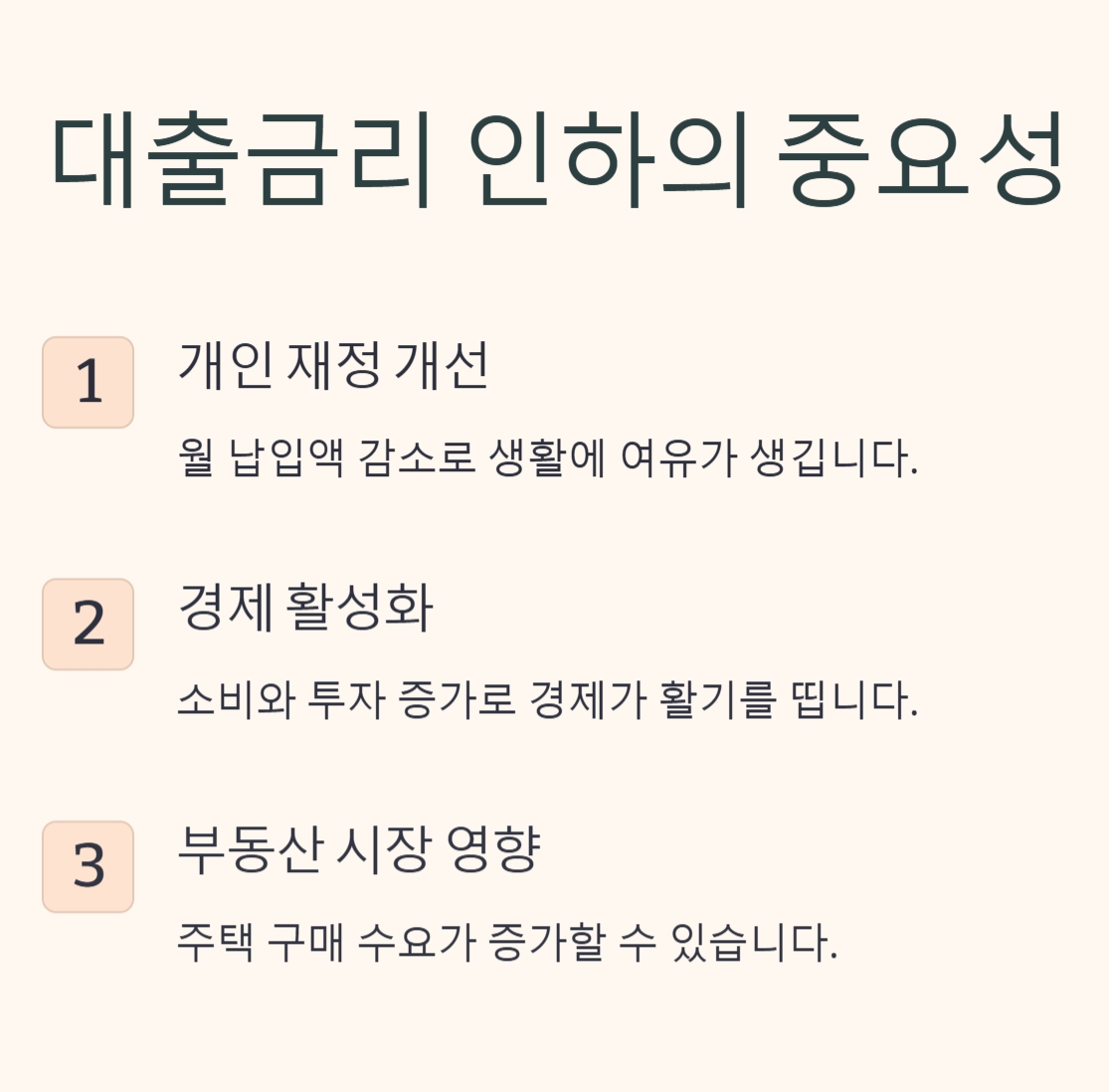 그때 금리가 살짝 내려갔을 뿐인데, 월 납입액이 확 줄어서 정말 놀랐어요! 이런 경험을 바탕으로, 대출금리 인하가 우리 삶에 어떤 영향을 미치는지 쉽게 풀어서 설명해볼게요.