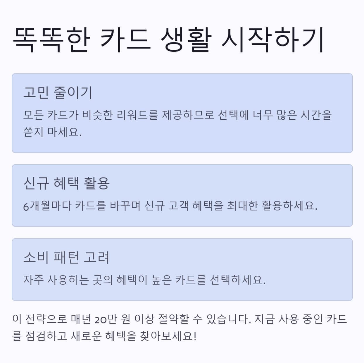결국 카드 선택 방법의 핵심은 고민 줄이고 실속 챙기기예요. 저도 이 전략으로 매년 20만 원 넘게 아끼고 있답니다!