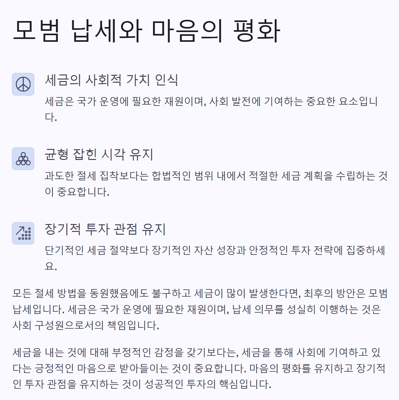 세금은 국가 운영에 필요한 재원이며, 납세 의무를 성실히 이행하는 것은 사회 구성원으로서의 책임입니다.
