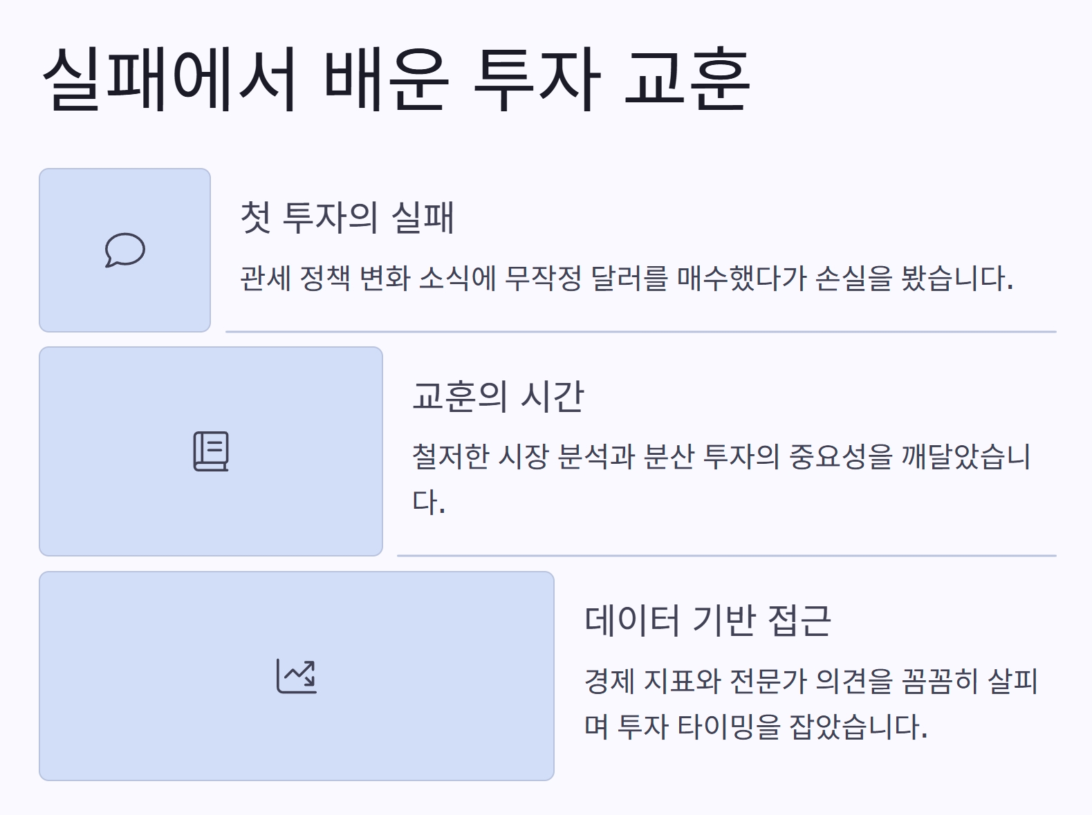 문제는 정보 부족과 감정적 결정이었다. 뉴스 헤드라인만 믿고 타이밍을 잘못 잡은 탓이다. 이 실패는 내게 철저한 시장 분석과 분산 투자의 중요성을 가르쳐줬다.