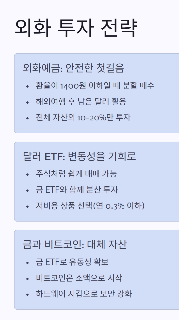 A: 외화예금이나 달러 ETF처럼 접근성이 높고 리스크가 낮은 상품부터 시작하세요. 소액으로 테스트하며 시장 감각을 익히는 게 중요합니다.
