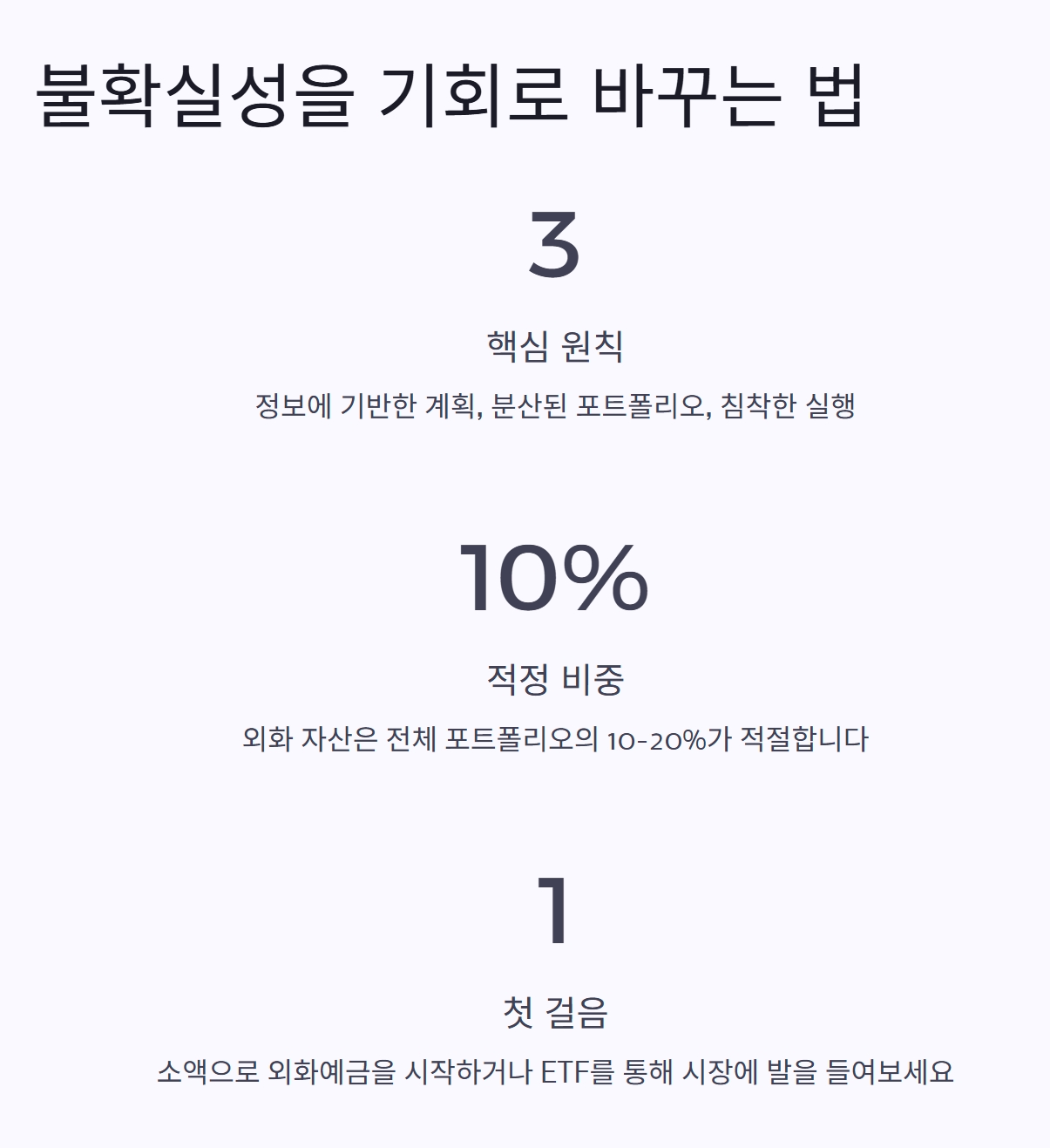 지금 당장 할 수 있는 첫걸음은? 소액으로 외화예금을 시작하거나, ETF를 통해 시장에 발을 들여보는 것이다. 당신의 투자 여정은 어디서 시작되나요? 아래 댓글로 당신의 계획을 공유해 보세요!