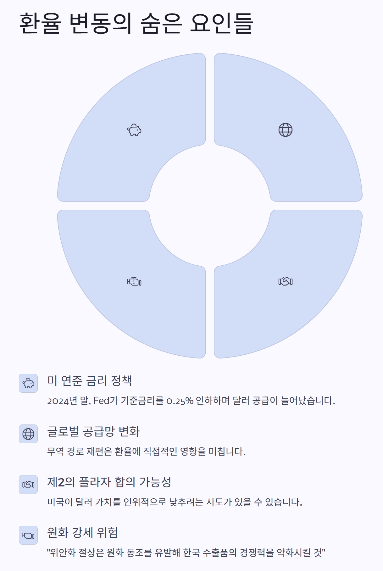 환율은 관세 정책 외에도 여러 요인에 의해 흔들린다. 미국 연방준비제도(Fed)의 금리 정책, 글로벌 공급망 변화, 그리고 지정학적 긴장감이 그 예다.