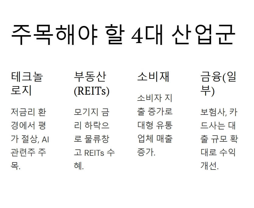 성장주 중심의 테크섹터는 저금리 환경에서 평가 절상되기 쉬워요. 애플, 마이크로소프트 같은 기업은 R&D 투자 확대가 기대되며, 특히 AI 관련주는 추가 상승 모멘텀을 얻을 수 있죠. 다만, PER이 과도하게 높은 종목은 조정 리스크가 있어요.