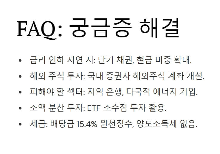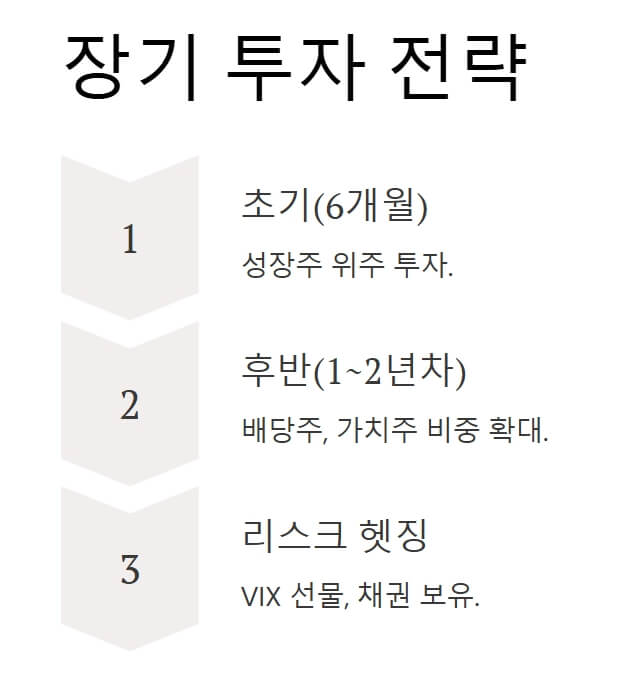 금리 인하가 경기 침체 신호일 수 있다는 점을 잊지 마세요. VIX(변동성 지수) 선물이나 채권(미국 장기국채 ETF: TLT)을 10%~15% 보유해 시장 충격에 대비하는 게 좋아요.