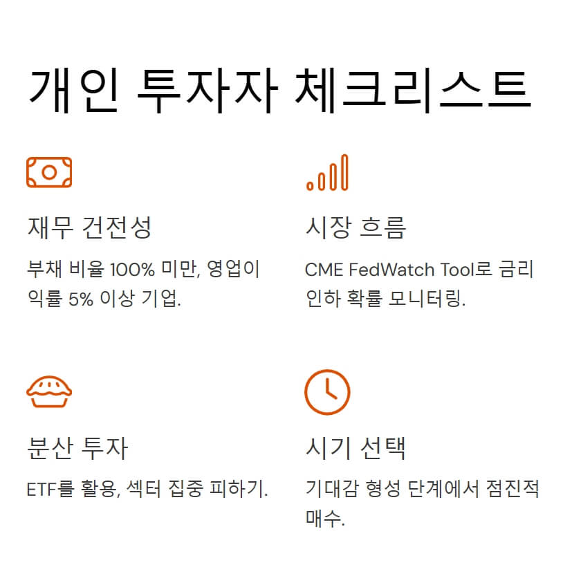 금리 인하 발표 직후가 아닌, 기대감이 형성되는 단계에서 점진적으로 매수하세요. 역사적으로 금리 인하 3개월 전부터 주가 상승이 시작됐죠.