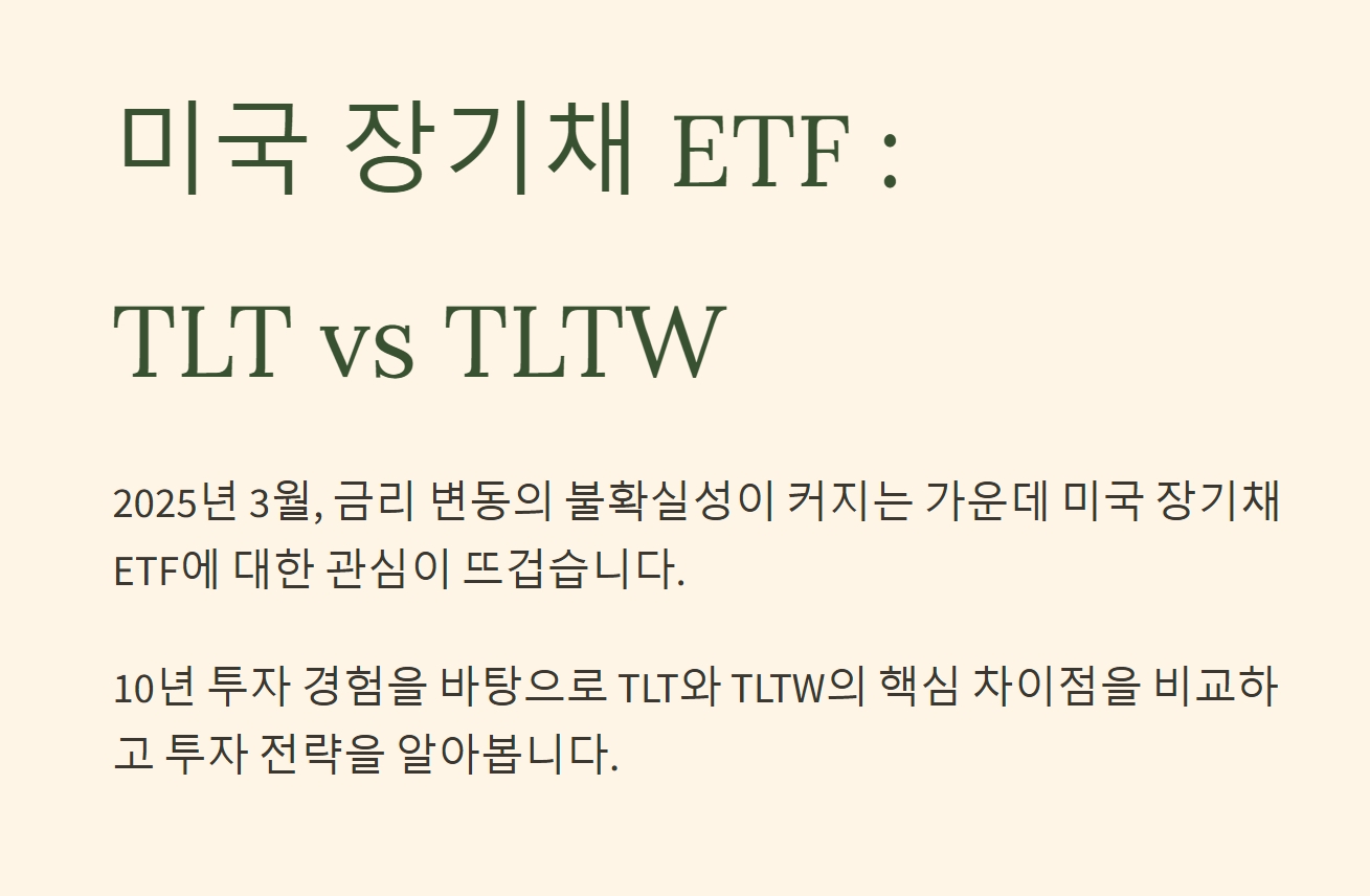 미국 장기채 ETF TLT와 TLTW를 비교 분석! 금리 변동과 듀레이션의 영향, 투자 전략을 10년 경험으로 풀어냅니다. 나에게 맞는 ETF는?