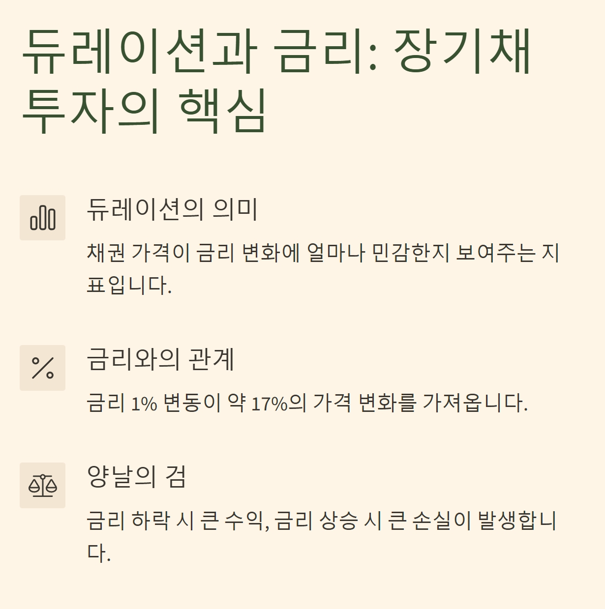 이건 양날의 검이에요. 금리가 떨어지면 큰 수익을 기대할 수 있지만, 반대로 오르면 손실도 큽니다.