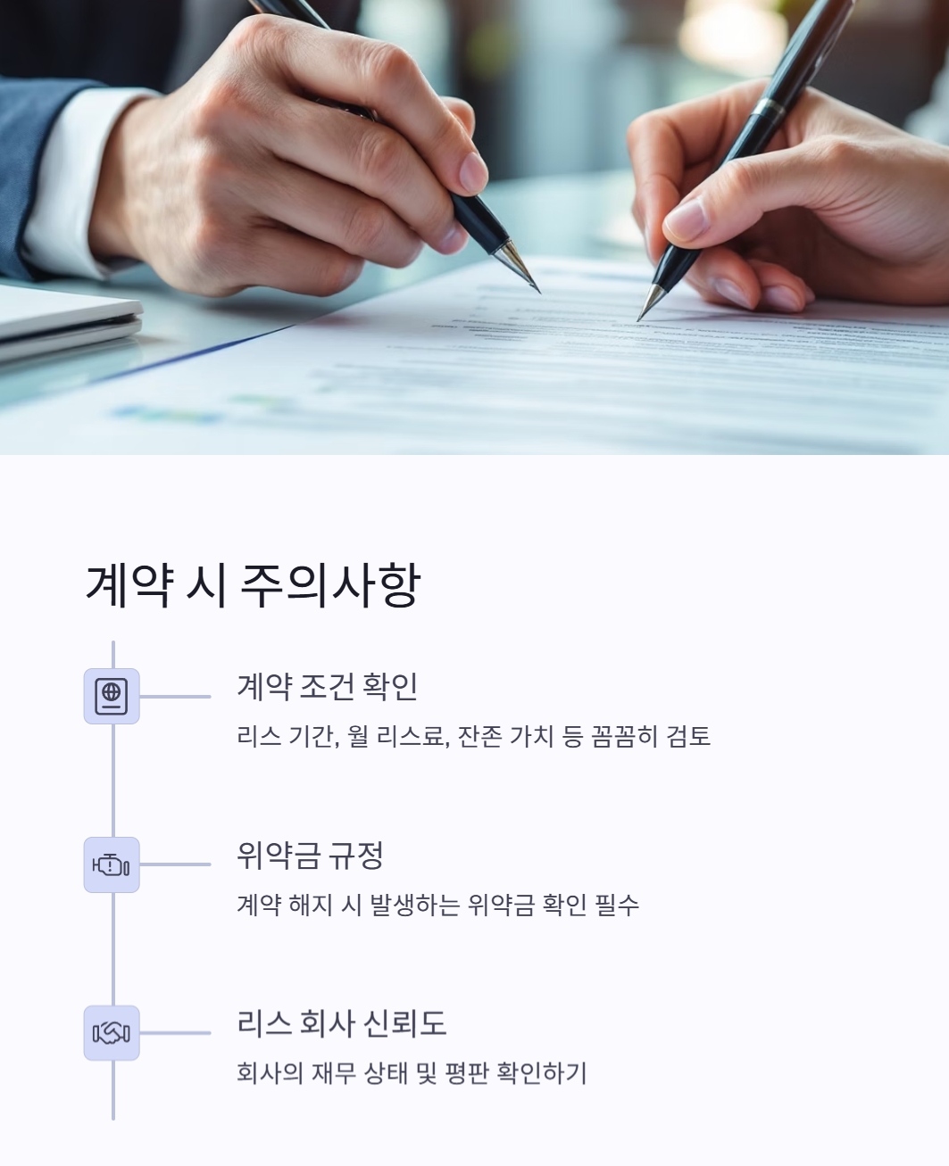 리스 기간, 월 리스료, 잔존 가치, 주행 거리 제한, 보험 조건 등 계약 조건을 꼼꼼히 확인하고, 불리한 조항은 없는지 검토해야 합니다. - 위약금 규정 확인: