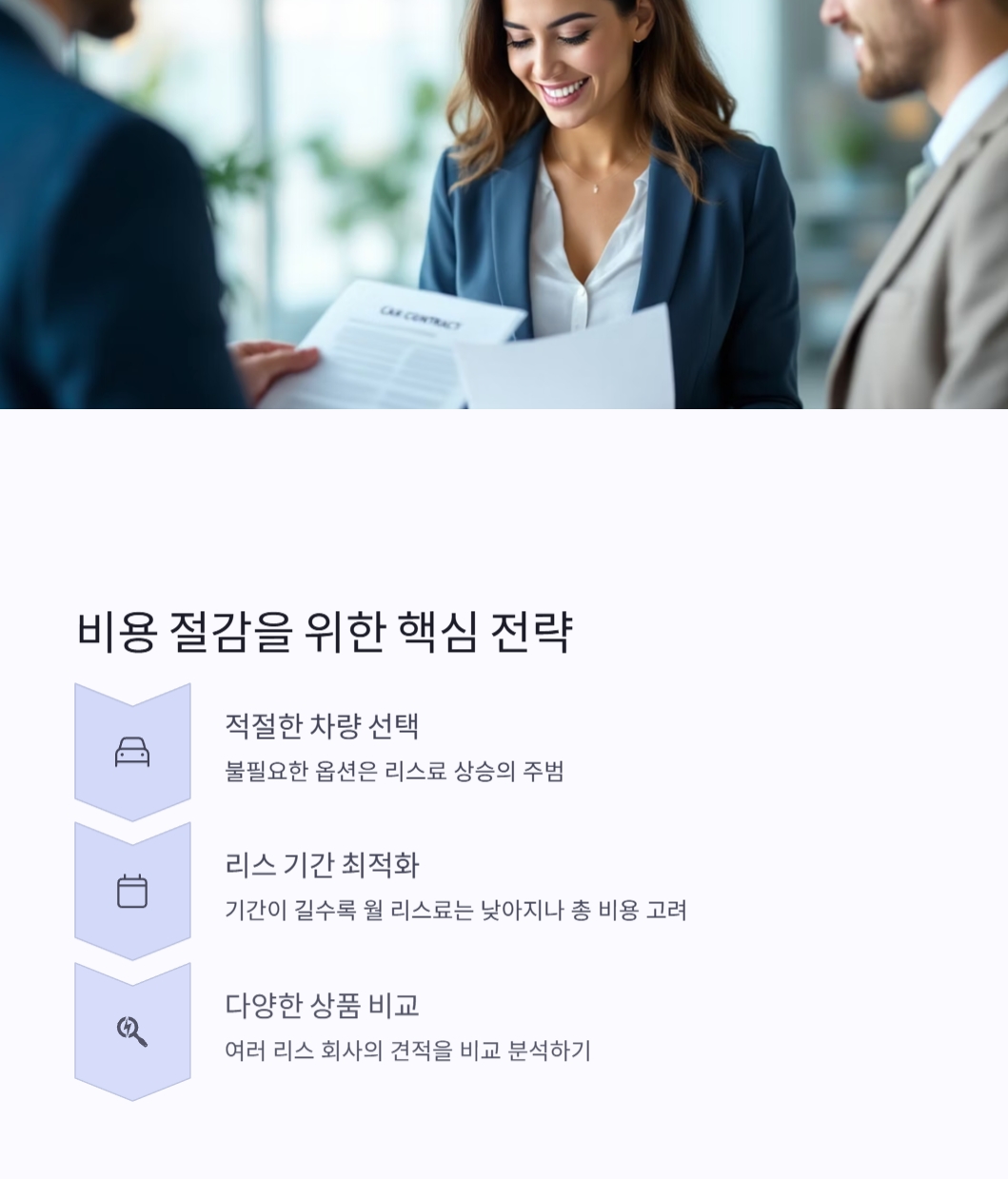 법인 자동차 리스를 통해 실질적인 비용 절감을 이루기 위해서는 단순히 저렴한 리스 상품을 선택하는 것만으로는 부족합니다. 다음 5가지 핵심 전략을 통해 숨겨진 비용을 줄이고, 효율적인 차량 운영을 실현할 수 있습니다.