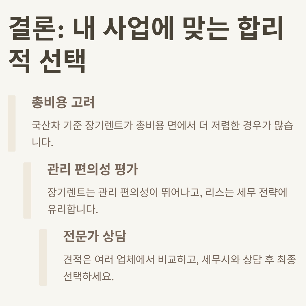 2025년 재계약 때는 장기렌트로 전환, 월 렌트료에 모든 비용이 포함되어 회계 처리와 현금 흐름 관리가 훨씬 쉬워졌다고 합니다.