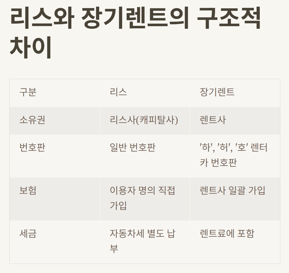| 구분 | 리스 | 장기렌트 |