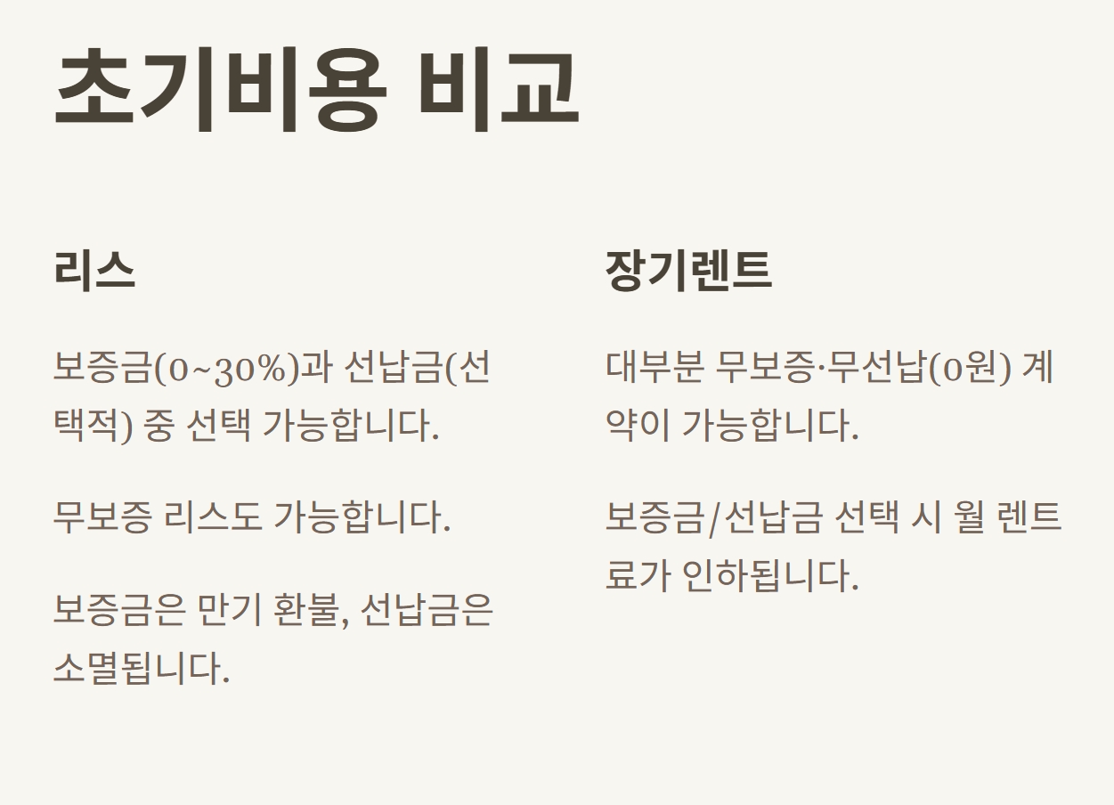 - 리스는 잔존가치 지급 후 인수, 장기렌트는 일부 인수 옵션(잔존가치 낮음, 인수 유리).