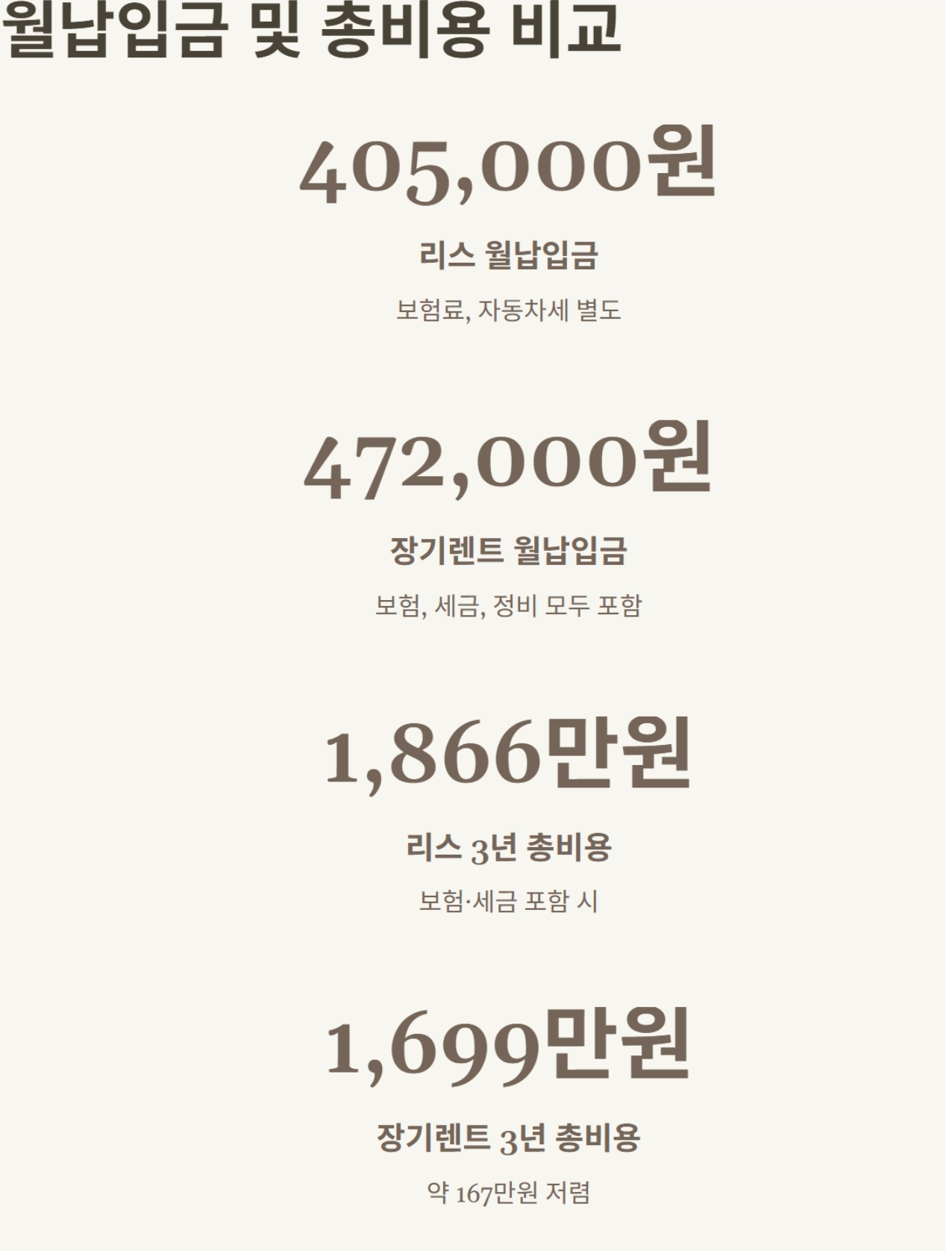 - 장기렌트가 3년간 약 167만 원 저렴 (보험·자동차세 포함 기준, 실제 조건에 따라 차이 발생)