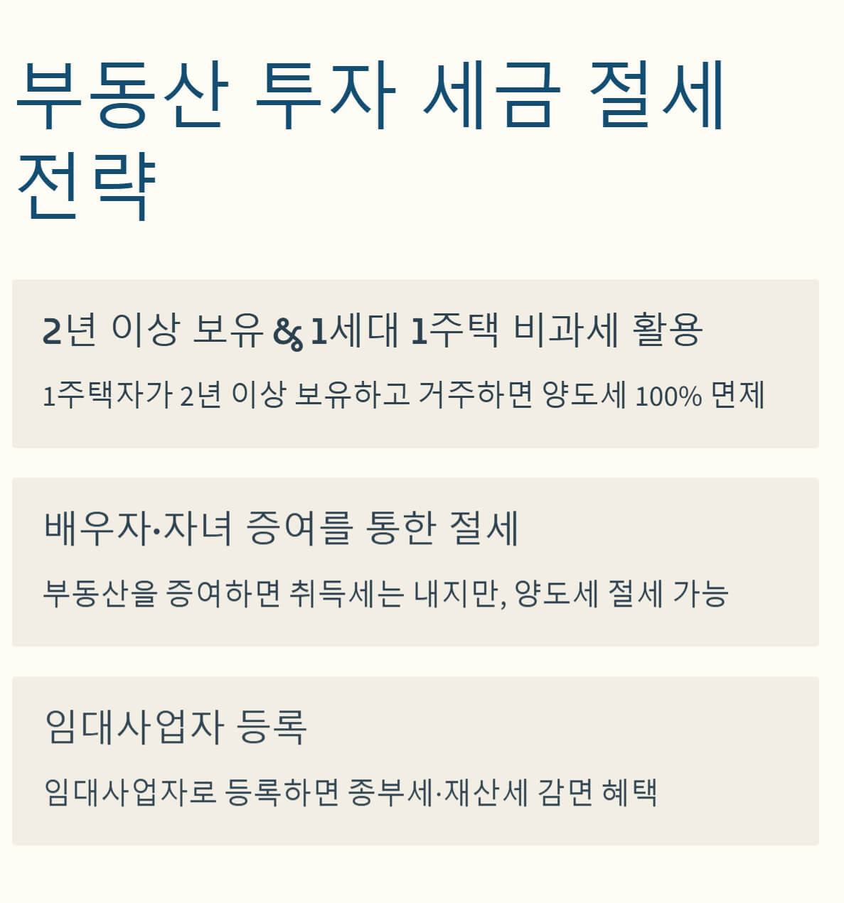 👉 2년 이상 보유, 1주택 비과세 혜택 활용, 배우자 증여 등을 고려하세요!