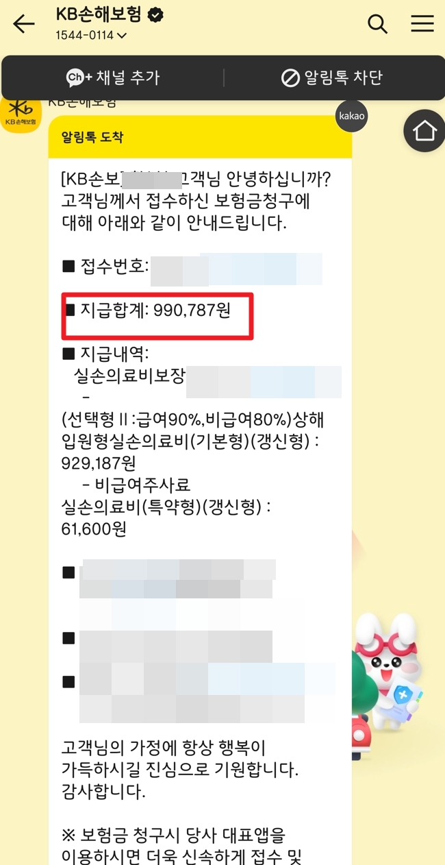 보험접수가 되면 카카오톡으로 접수번호가 연락이 옵니다. 그리고 2~5일 후, 카카오톡 및 문자로 실비청구 완료 문자가 옵니다. 계좌를 확인하면 실비보험 청구액이 기본공제 제외하고 들어와 있습니다.