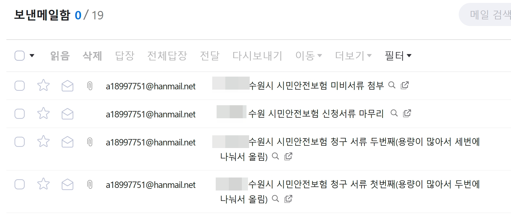 2.  메일을 보낼때 이름을 맨앞에 적고 수원시민안전보험 청구 서류 몇번째 라고 보내시면 됩니다.