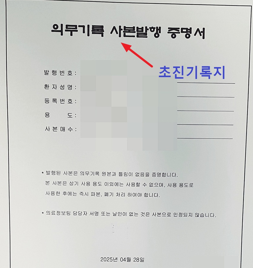 5. 초진 기록지 또는 의무 기록 사본 (병원 발급): 사고 당시의 상황과 최초 진료 내용이 상세하게 기록된 병원 서류입니다. 병원에 요청하여 발급받아야 합니다.