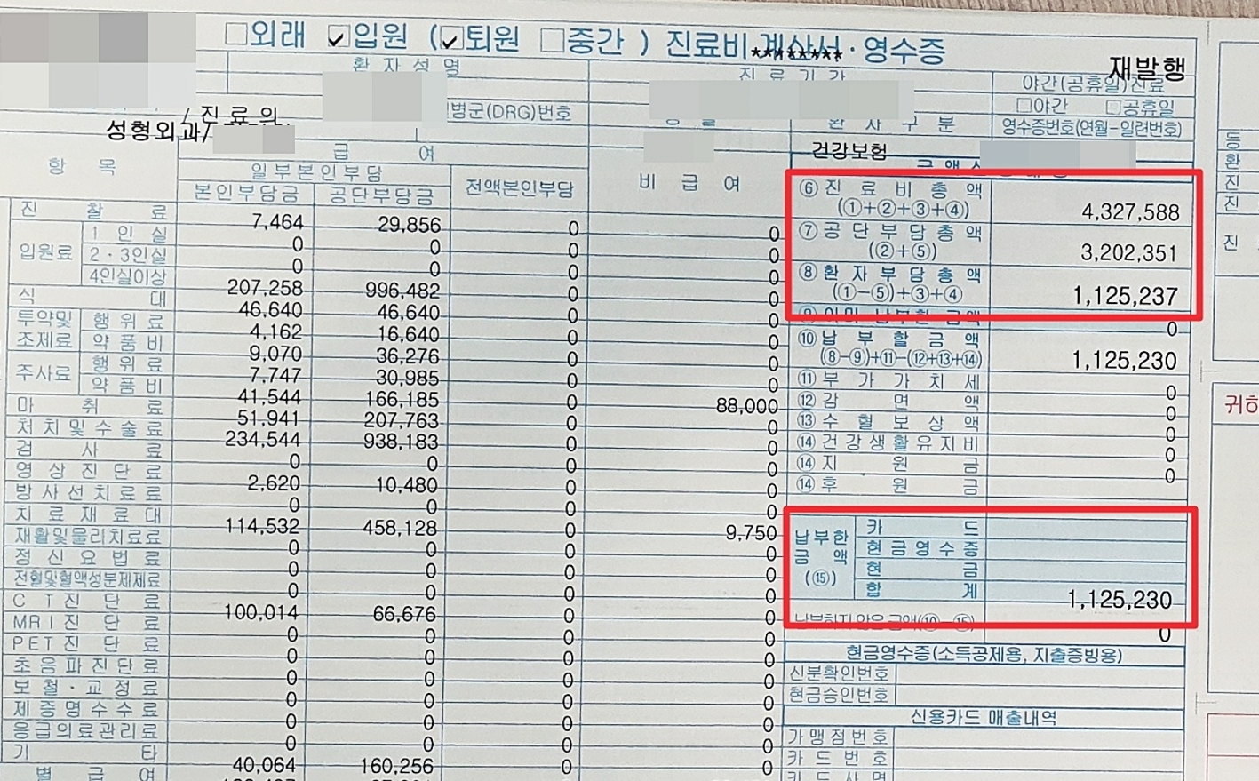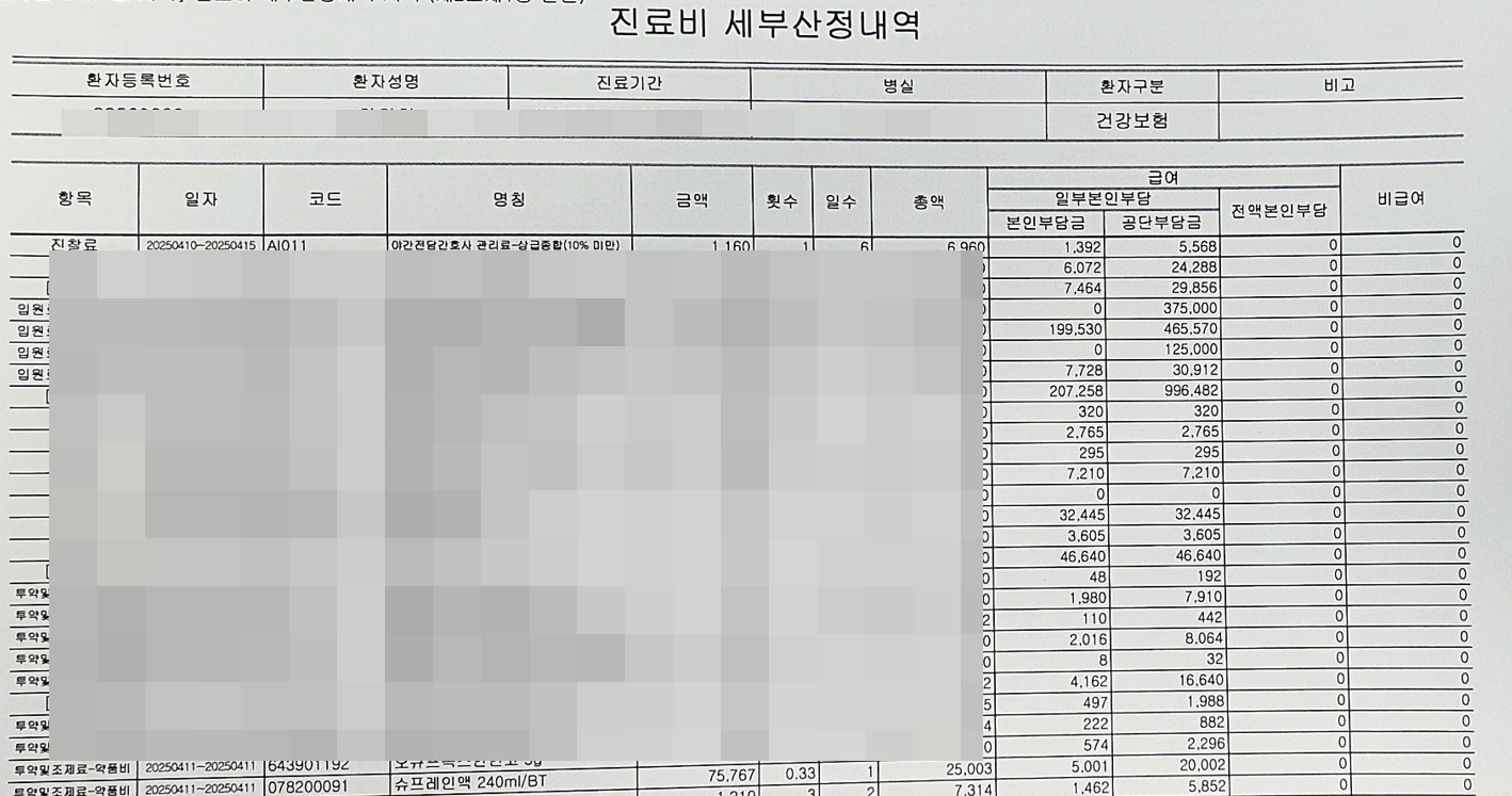 치료 과정에서 발생한 세부적인 의료비 내역을 확인할 수 있는 병원 서류입니다.