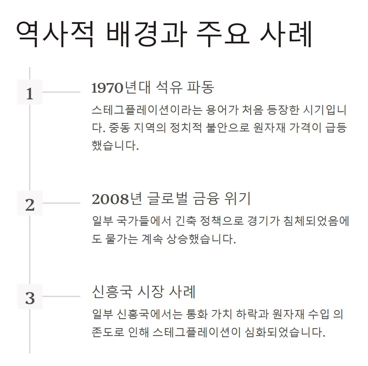 중동 지역의 정치적 불안으로 인한 석유 파동이 발생하면서 원자재 가격이 급등했고, 이로 인해 전 세계적으로 물가는 상승했지만 경제 성장은 둔화되는 현상이 나타났습니다.