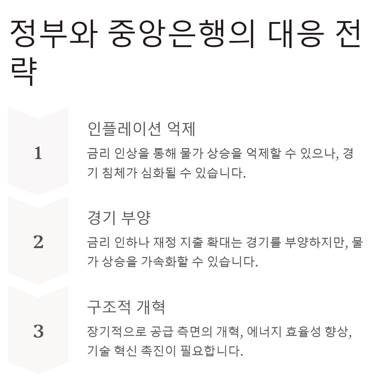 이런 상황에서는 단기적인 대증요법보다는 경제의 구조적 문제를 해결하는 방향으로 정책이 수립되어야 합니다. 공급 측면의 개혁, 에너지 효율성 향상, 기술 혁신 촉진 등이 장기적인 해결책이 될 수 있습니다.