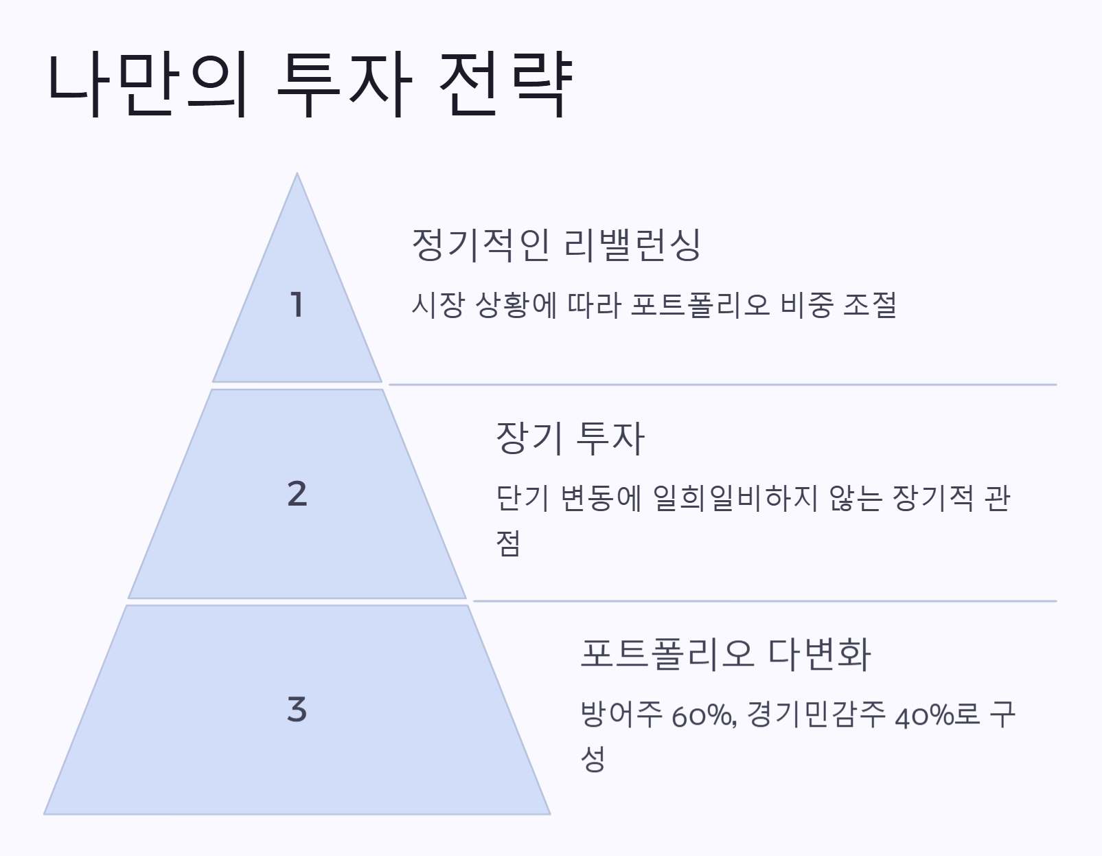 방어주와 경기민감주의 비중을 적절히 조절하여 포트폴리오를 구성했습니다.- 방어주 (60%): 필수 소비재 ETF, 유틸리티 ETF, 헬스케어 ETF에 분산 투자