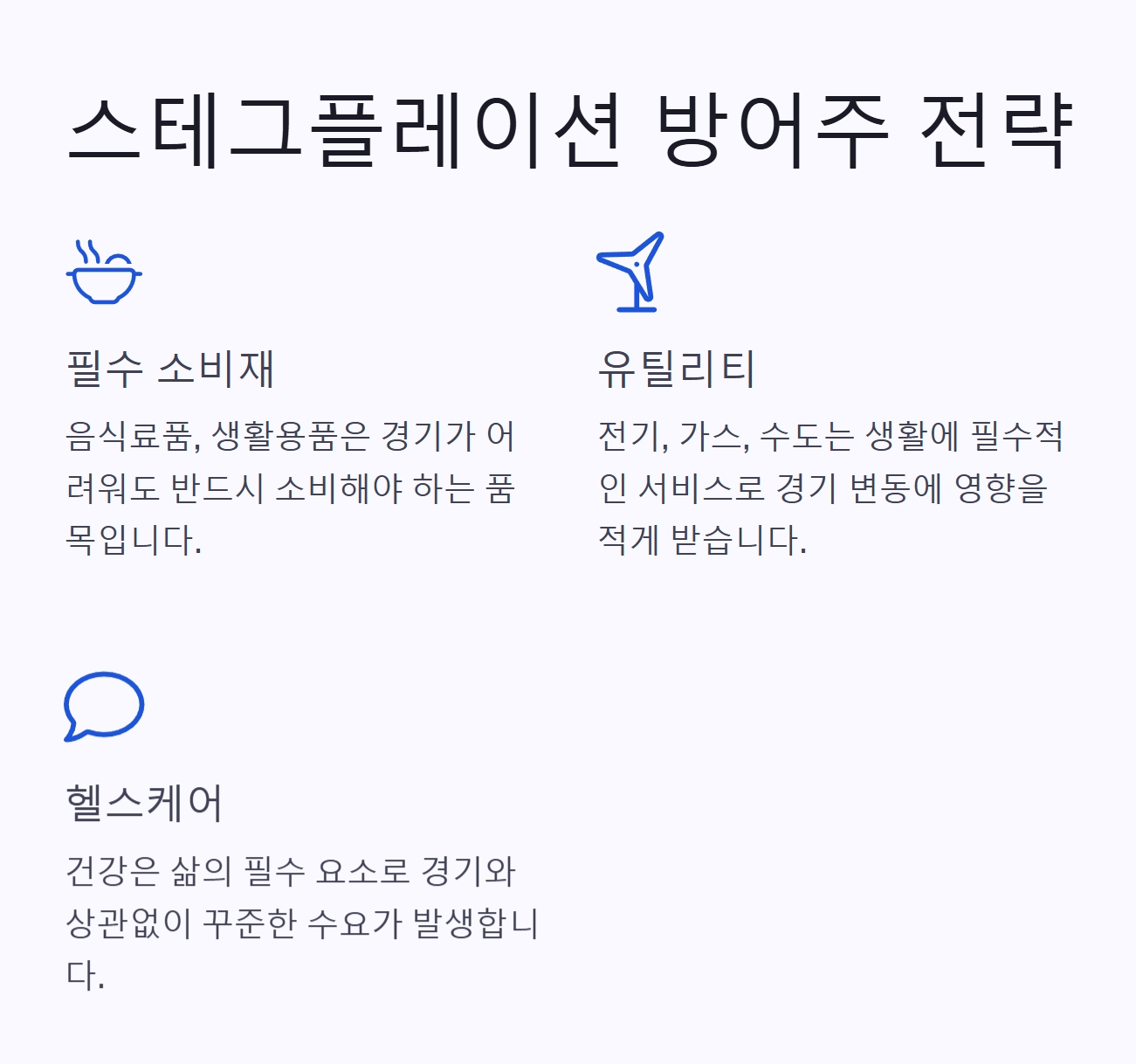 스테그플레이션 방어주는 경기가 좋든 나쁘든 꾸준한 수요가 발생하는 필수 소비재, 유틸리티, 헬스케어 등의 업종에 속한 기업들을 말합니다.