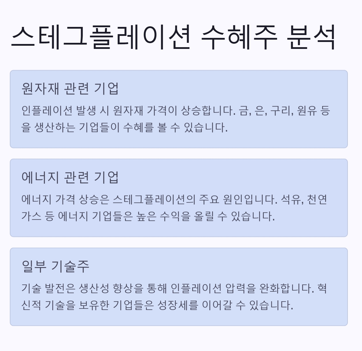 스태그플레이션이라고 해서 모든 기업이 어려움을 겪는 것은 아닙니다. 오히려 이 시기에 더 큰 이익을 얻는 기업들도 있습니다. 바로 스테그플레이션 수혜주인데요,