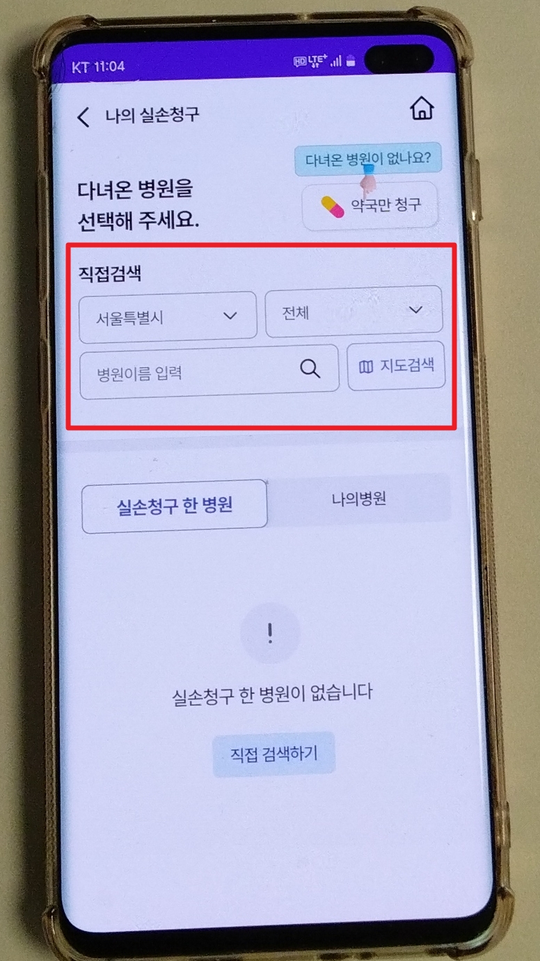 자신의 의료비를 청구할 실손보험사를 선택 후 치료 받은 병원을 검색해 클릭합니다.
