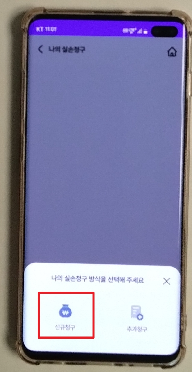 나의 실손청구 배너를 클릭 → 신규 또는 추가청구 배너 클릭 →  사고 유형과 사고 발생 일시 입력 →  개인 정보 조회 에 관한 사항 동의 →  다음 클릭