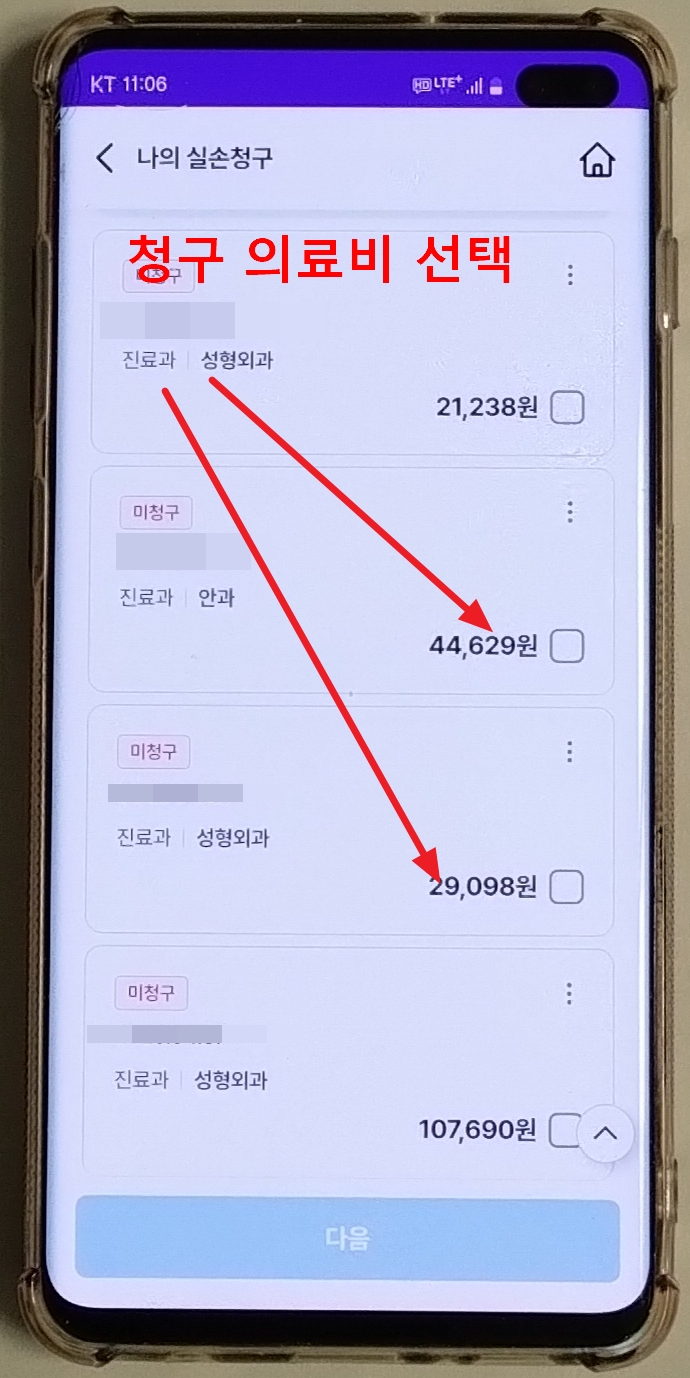 연동된 진료 기록 중 보험금을 신청하고 싶은 항목을 선택 → 제출 서류 체크 후 다음 진행합니다.