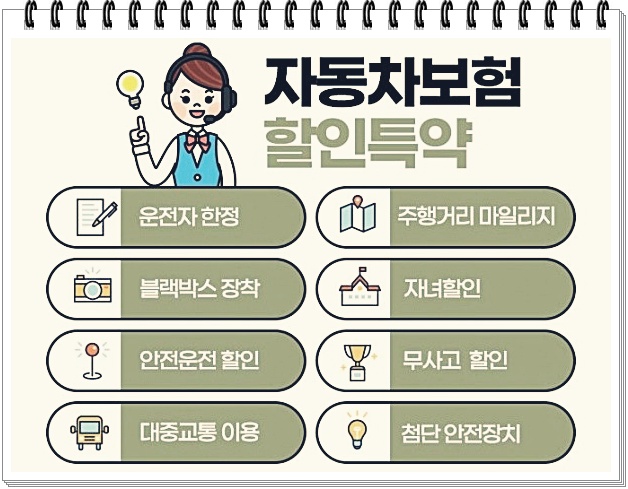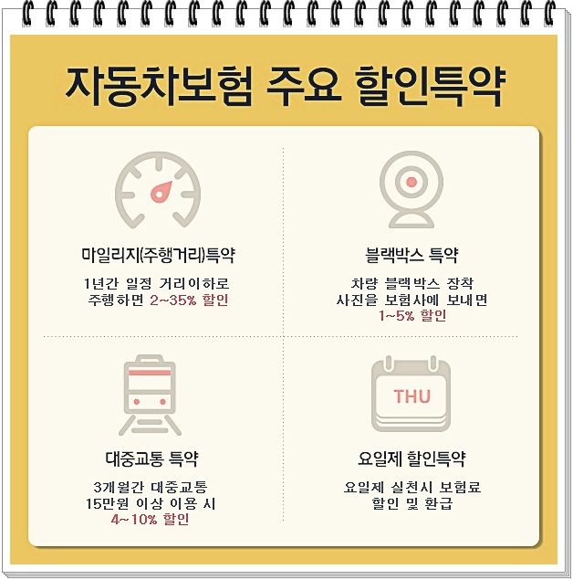 주행거리 할인, 블랙박스 할인, 자녀 할인, 대중교통 이용 할인 등 다양한 할인 특약이 존재합니다. 본인에게 해당되는 특약을 빠짐없이 적용하는 것이 보험료를 줄이는 핵심입니다.