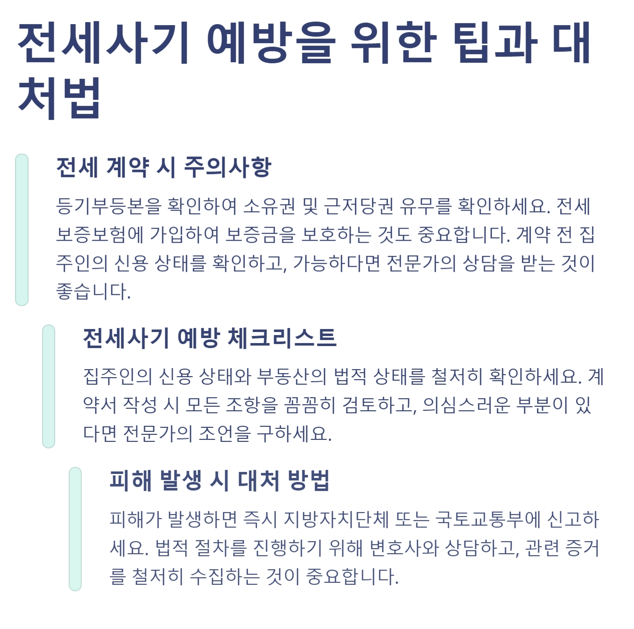 . 전세 계약 시 철저한 준비와 전문가의 도움을 받아 피해를 예방하세요. 필요 시 정부 지원 정책을 적극 활용하여 경제적 부담을 줄이세요.