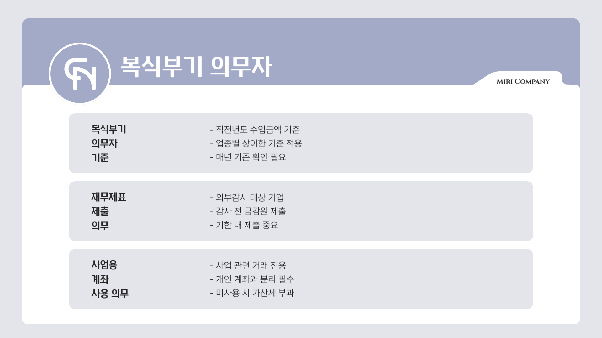- A: 복식부기 의무자의 경우 사업용 계좌 신고 및 사용 의무가 있으며, 미신고 시 가산세가 부과될 수 있습니다.