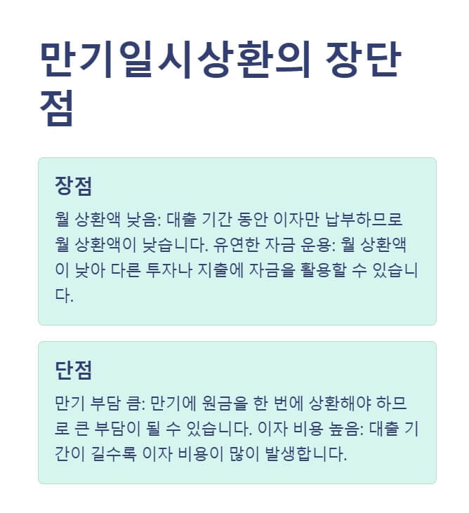 - 만기 부담 큼: 만기에 원금을 한 번에 상환해야 하므로 큰 부담이 될 수 있습니다.