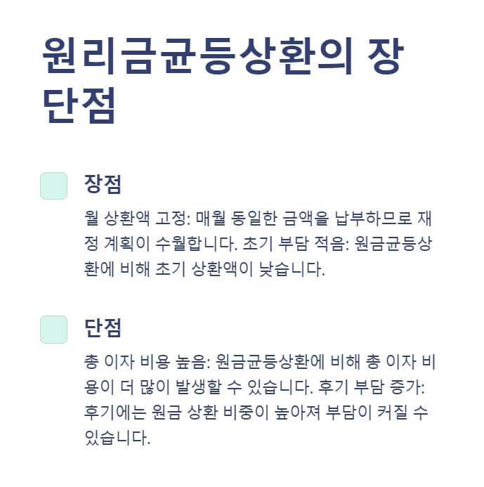 - 총 이자 비용 절감: 원리금균등상환에 비해 총 이자 비용이 적게 듭니다.