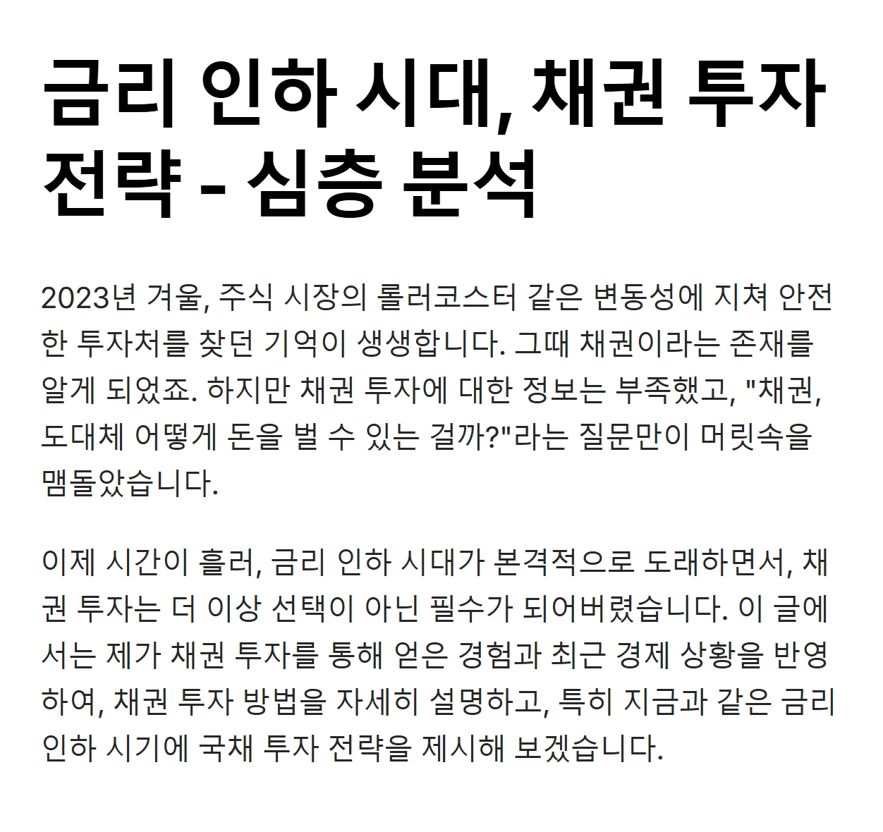 이제 시간이 흘러, 금리 인하 시대가 본격적으로 도래하면서, 채권 투자는 더 이상 선택이 아닌 필수가 되어버렸습니다.