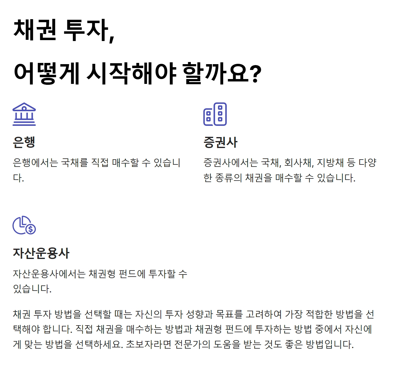 채권 투자는 은행, 증권사, 자산운용사 등 다양한 기관을 통해 할 수 있습니다.